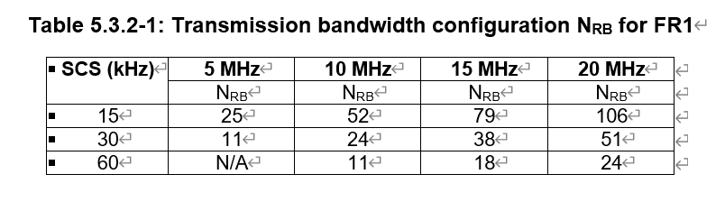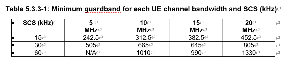 The maximum transmission bandwidth configuration and the minimum guardband for different channel bandwidths and SCS values are shown in the two tables below: