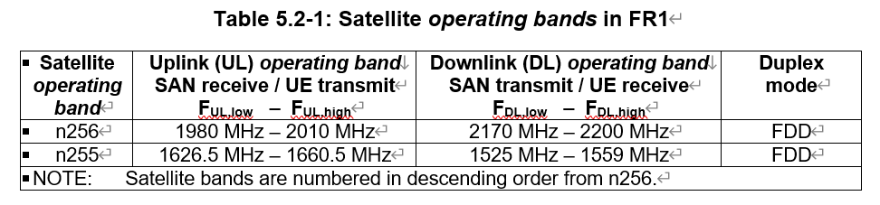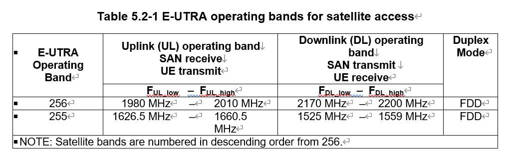The frequency ranges specified for satellite access systems in 3GPP NTN fall within the L (255) and S (256) bands; more precisely, they are subsets of the L and S bands used for mobile satellite services. Satellite band numbers are assigned starting from 256 and decreasing; currently there are bands 256 and 255, and there may be 254 in the future. Note that in LTE the band numbers are 256 and 255, as shown below: