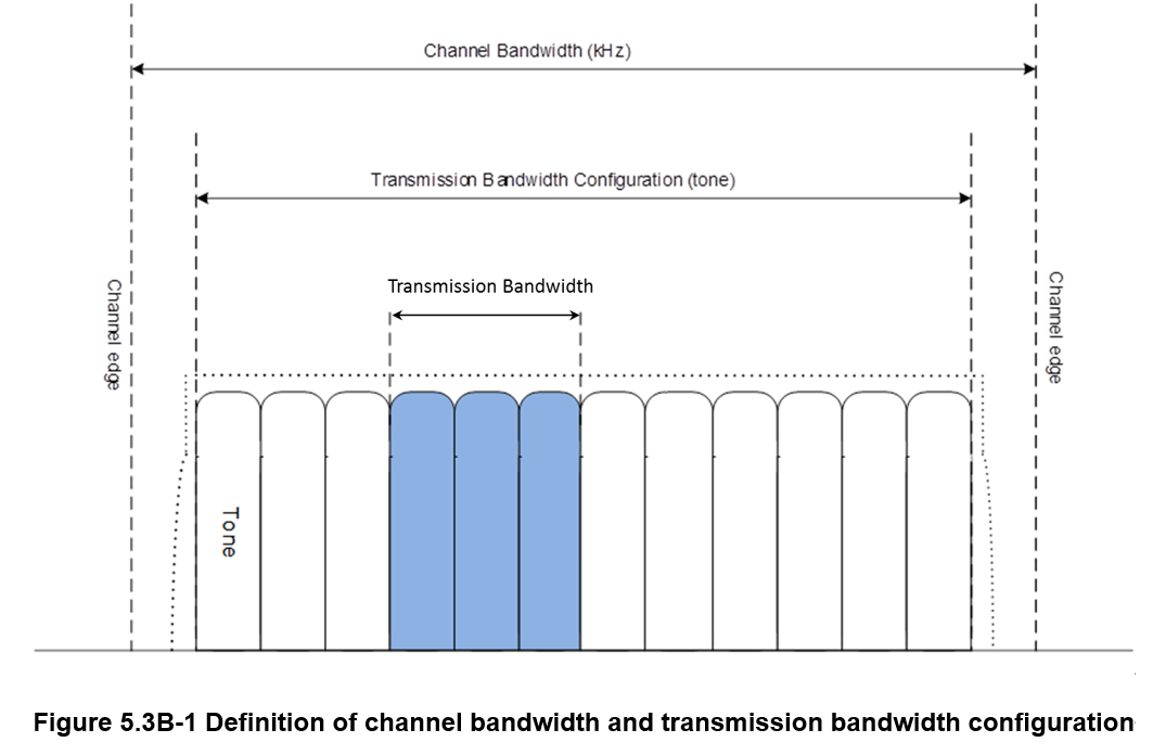 Bandwidth definitions are the same as for terrestrial cellular networks. The following illustrates the relationship between channel bandwidth, transmission bandwidth configuration, and RBs:
