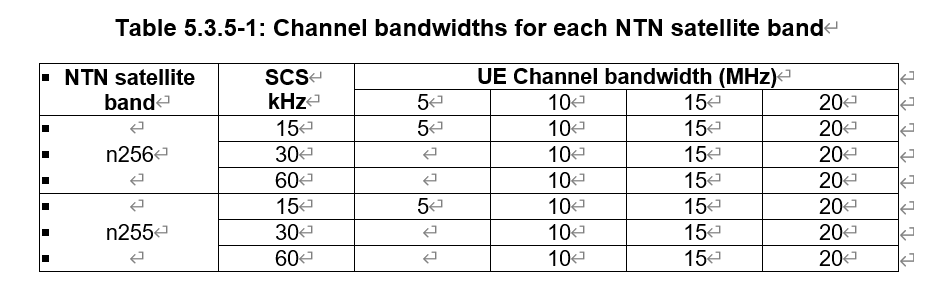 For NR NTN SAN and UE, the channel bandwidth under different bands and SCS values is shown below: