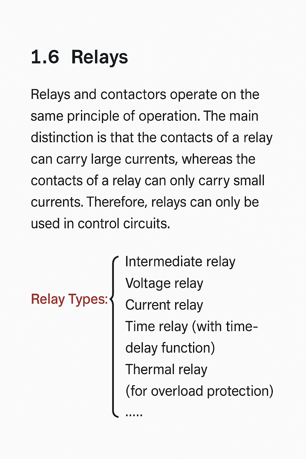 Relays and contactors operate on the same working principle. The main difference is that the main contacts of contactors can carry large currents, while relay contacts can only carry small currents. Therefore, relays are used only in control circuits.