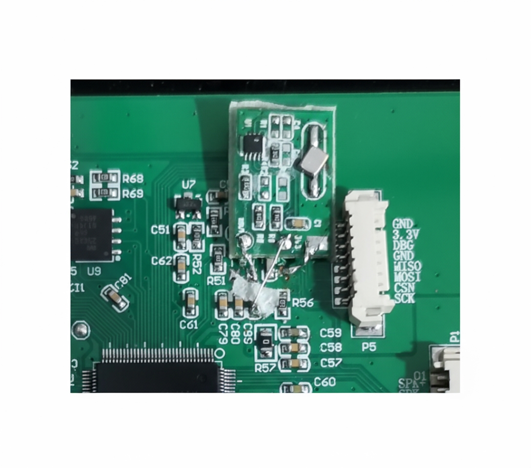 After these three measures we tested in an anechoic chamber. The clock emissions were reduced but still slightly above the limit. We suspected the clock was coupling onto other signal lines and radiating. Using a spectrum analyzer to scan signal lines near the clock, we found a strong clock component on the TX line, so we added an RC filter directly on the TX line. In addition, the PCB ground and the display ground were not connected; an insulating layer separated them, so we tied the grounds together. Beyond the three standard measures, we added two more actions.
