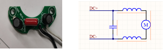 During operation, the commutator continuously rotates, and rapid friction occurs between commutator segments and carbon brushes, causing arcing. Arcing generates high-frequency noise that radiates outward via motor leads and gaps. Metal motor housings can shield and absorb some radiated noise inside the motor, but noise that radiates through the motor leads must be addressed. One approach is to add a small filter board in the motor structure to isolate motor leads from external wiring and reduce motor emissions. Many motors already include some filtering; an example customer motor with an internal small board and its equivalent circuit is shown below.