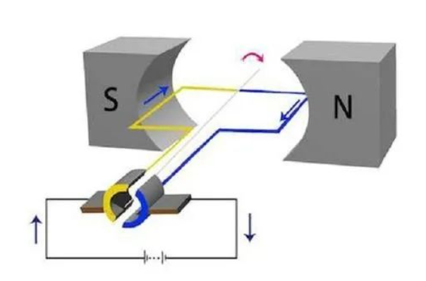 Using the left-hand rule: orient the palm so that magnetic field lines enter the palm (palm facing the N pole, back of the hand facing the S pole), and align the four fingers with the direction of current. The thumb then indicates the force direction on the conductor. In the figure below, S and N are permanent magnets. The coil in the magnetic field experiences a force that causes clockwise rotation. Because of the commutator, after the coil rotates 180°, the direction of current in the coil is still from left to right, so the coil continues rotating clockwise. When there are two, three, or more coils and commutator segments, the device becomes a typical brushed DC motor. The common structure consists of permanent magnets (stator) + coil windings (rotor) + commutator + carbon brushes.