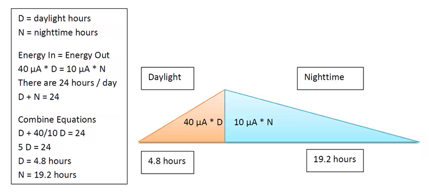 Consider a solar-powered wireless sensor node that transmits data every 20 minutes with an average transmit current of 10 μA. A solar panel supplies 50 μA of continuous current during daylight. The net charging current during daytime is 40 μA, while the battery discharges at 10 μA at night. If the system receives at least 4.8 hours of sunlight per day, the harvested energy can support perpetual operation.