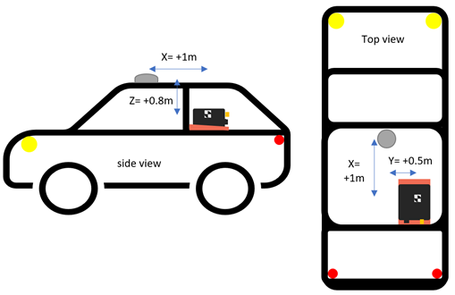 The diagram below shows an example of measuring the GNSS lever arm after installing an MTi and GNSS antenna in a car. The X-Y-Z coordinates should be measured according to the sensor coordinate frame printed on the side label of the MTi. Pay attention to coordinate signs: if the antenna is mounted to the right of the MTi, the Y coordinate should be negative. In this example the final vehicle lever arm vector is [1.00, 0.50, 0.80] (m).