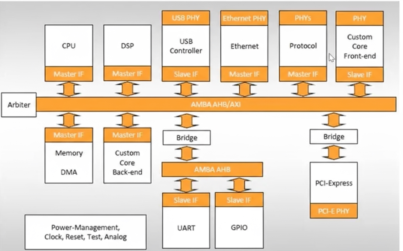 SoC integration engineers combine IP blocks into a complete SoC. A typical SoC contains IPs such as CPU, DSP, USB peripherals, and memory. RTL design also includes support for built-in self-test (BIST) and design-for-test (DFT).