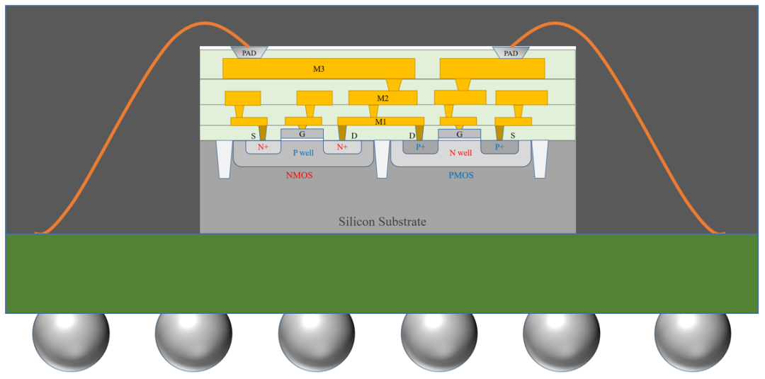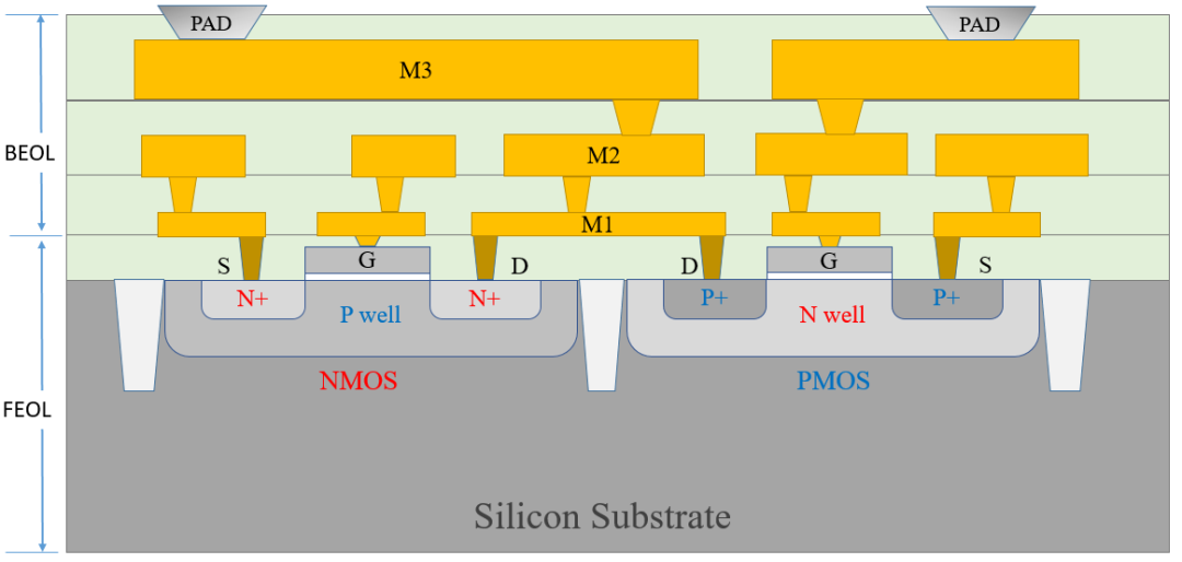 The diagram below shows FEOL and BEOL: transistors are fabricated on the silicon substrate, then connected via metal interconnect and routed out to the chip pads.