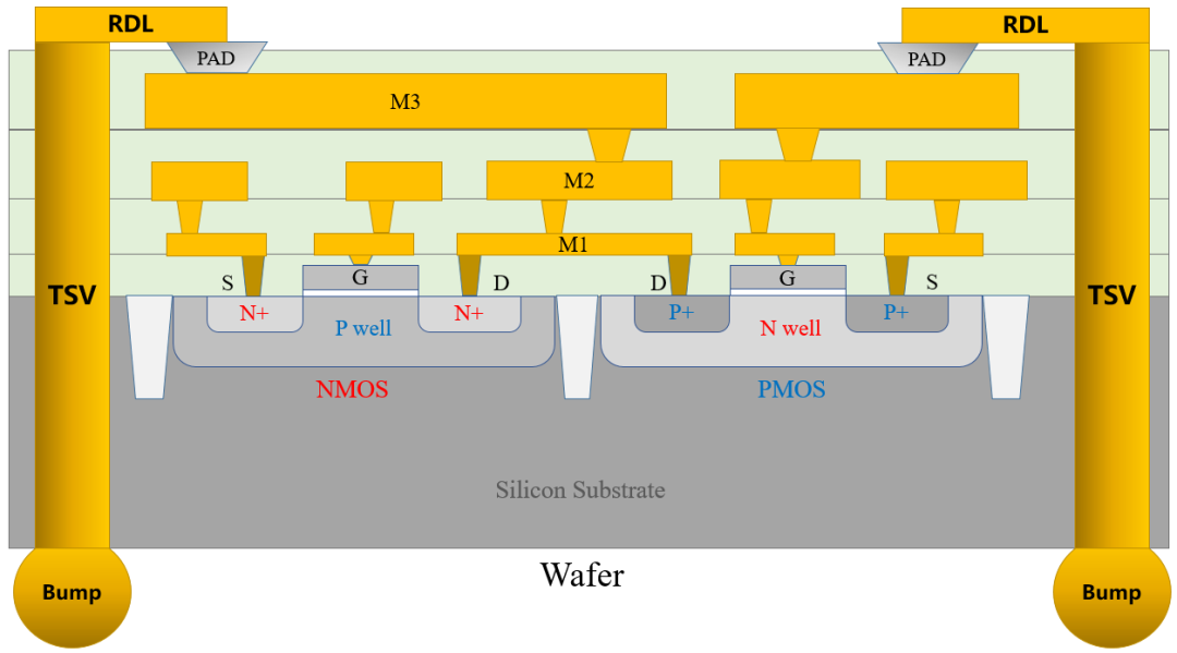 Transistors (NMOS or PMOS) are fabricated on the silicon substrate, connected via contact holes to on-chip metal routing, and routed to chip pads. RDL then connects to 3D TSV and uBumps, which link to silicon interposer RDL and 2.5D TSV. Bumps connect to the package substrate, whose traces and vias lead to a BGA, and finally to PCB routing and vias.