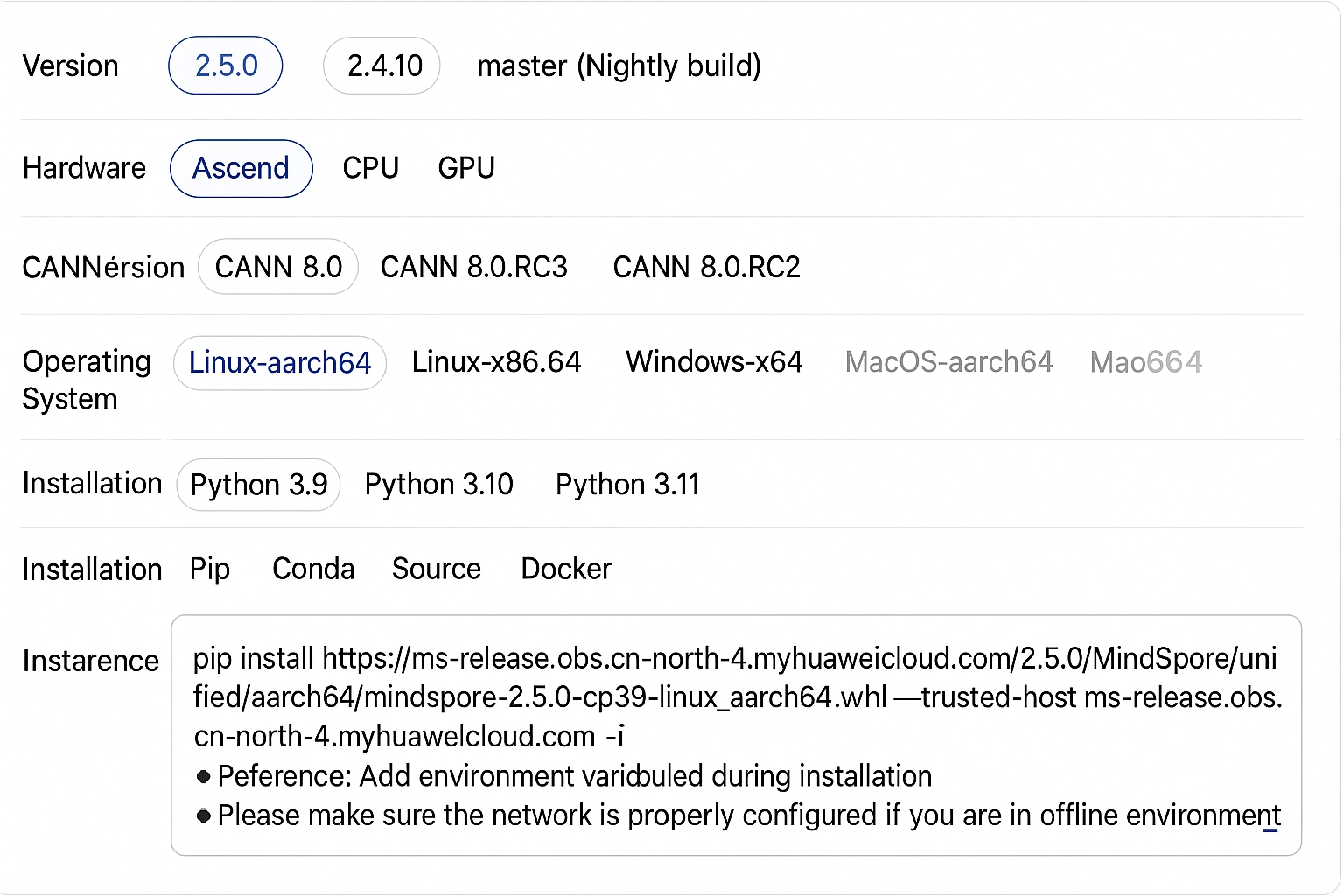 After dependencies are installed, install MindSpore 2.5.0. Visit the MindSpore official site and select the matching MindSpore, Python, and CANN versions (the screenshots below match this configuration). Copy the installation command into your shell and execute it.
