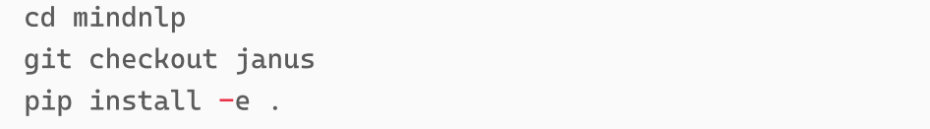 First, download the MindSpore NLP code. The repository has been adapted for Janus. Install MindSpore NLP from source by running the following commands: