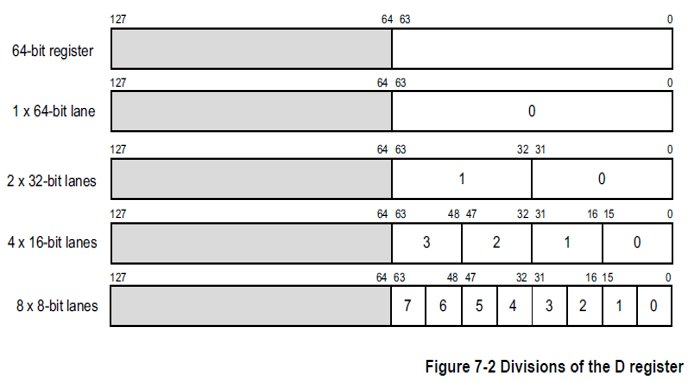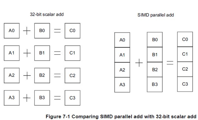 Modern ARM CPUs commonly include a NEON co-processor used for SIMD parallel vector acceleration in floating-point and multimedia workloads. The basic principle of NEON SIMD vector processing is shown below.