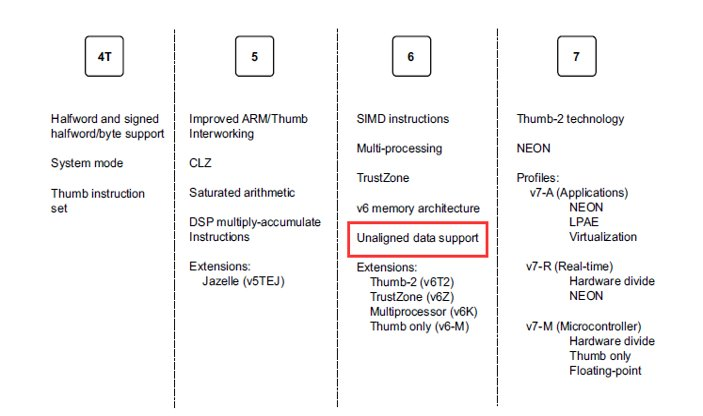 The ARM instruction set began supporting unaligned memory accesses from ARMv6 (ARM11). Older ARM9 CPUs do not support unaligned accesses. ARM architecture features have evolved over iterations.