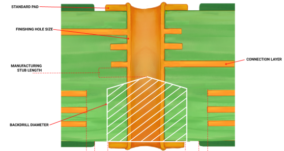 • Stub Removal: The unused copper stub is removed, leaving a clean via path for the signal to travel through.